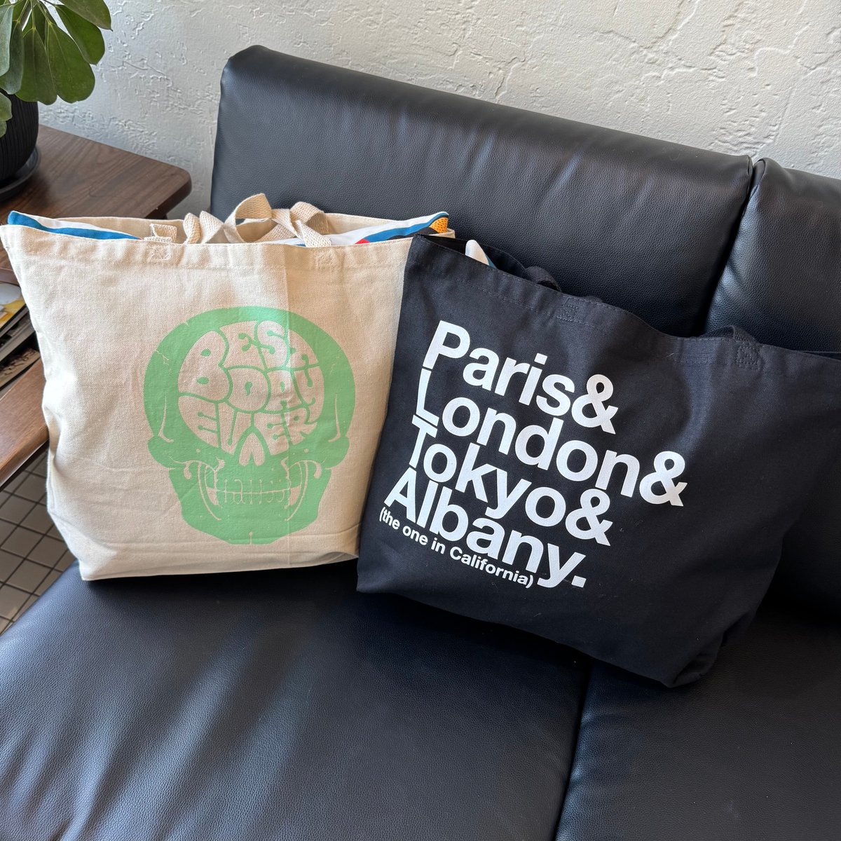 larger-sized, heavyweight natural canvas tote, or large-sized, regular weight black tote, featuring the fashion capitals of the world, with the bestdayever skull on the reverse side (current edition in mint). Perfect size for the Farmers Market...